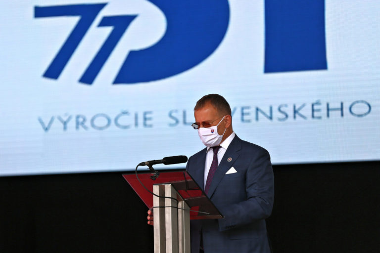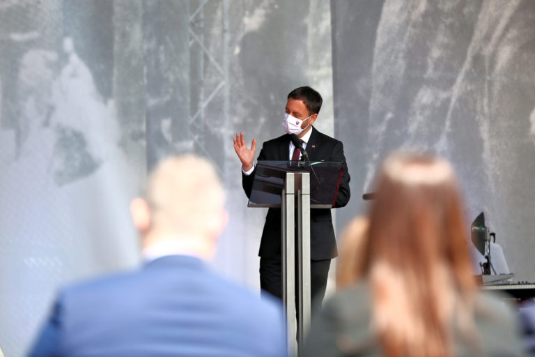 Premiér SR Eduard Heger v príhovore počas osláv 77. výročia Slovenského národného povstania (SNP) v Banskej Bystrici. Banská Bystrica, 29. august 2021. Foto: SITA/Peter Rusko