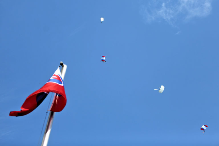 Zoskok parašutistov počas osláv 77. výročia Slovenského národného povstania (SNP) v Banskej Bystrici. Banská Bystrica, 29. august 2021. Foto: SITA/Peter Rusko