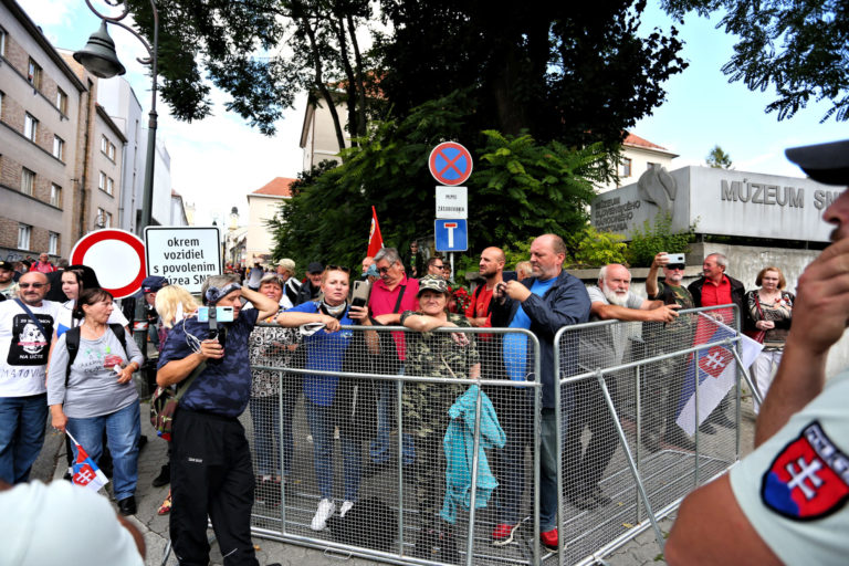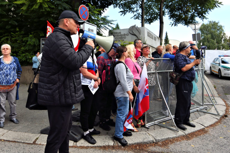 Skupina demonštrantov pred Múzeom SNP počas osláv 77. výročia Slovenského národného povstania (SNP) v Banskej Bystrici. Banská Bystrica, 29. august 2021. Foto: SITA/Peter Rusko