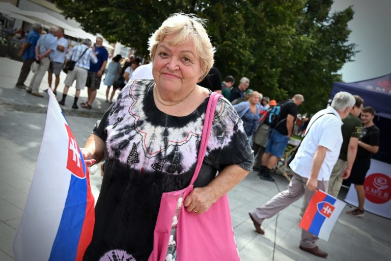 Účastníčka počas zhromaždenia organizovaného stranou SMER-SSD pri príležitosti 79. výročia Slovenského národného povstania (SNP) na Námestí SNP vo Zvolene. Zvolen, 29. august 2023. Foto: SITA/Jakub Julény.