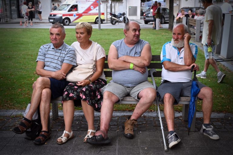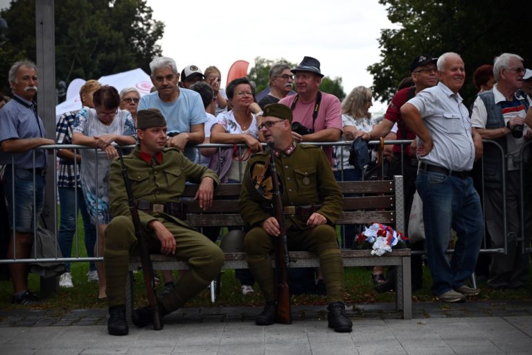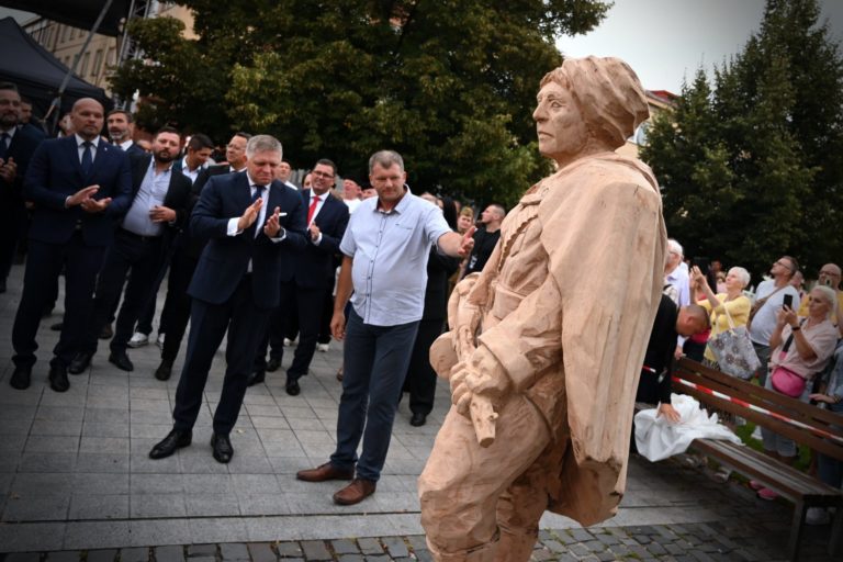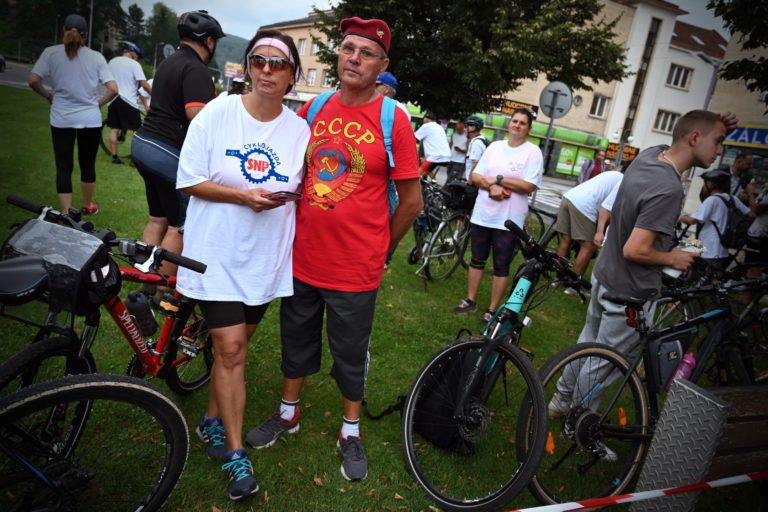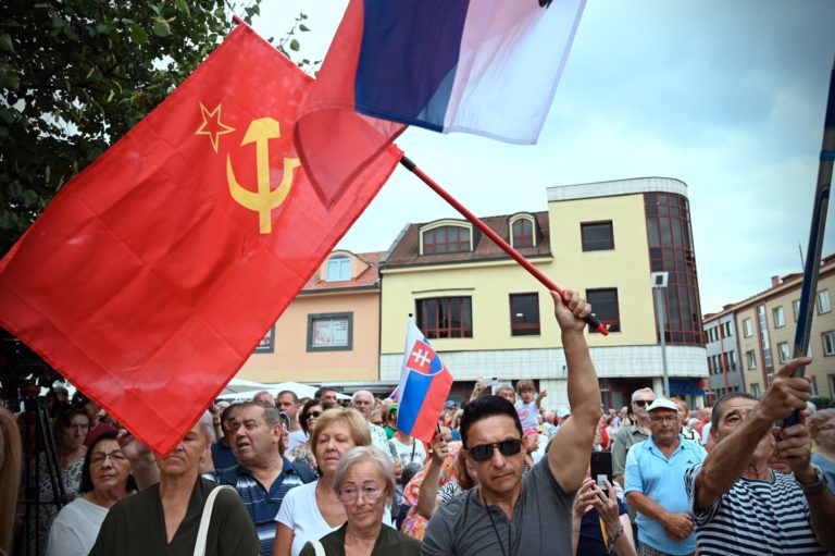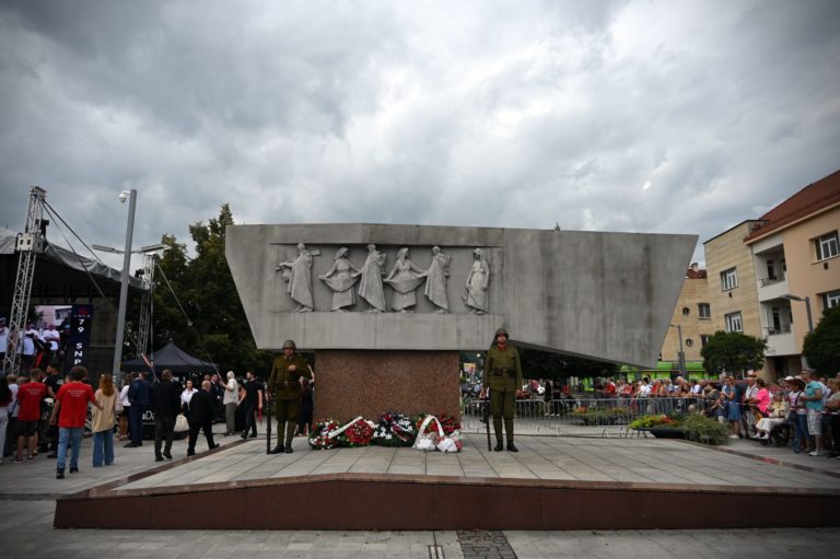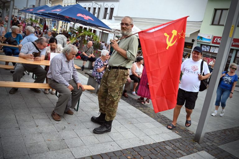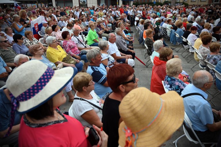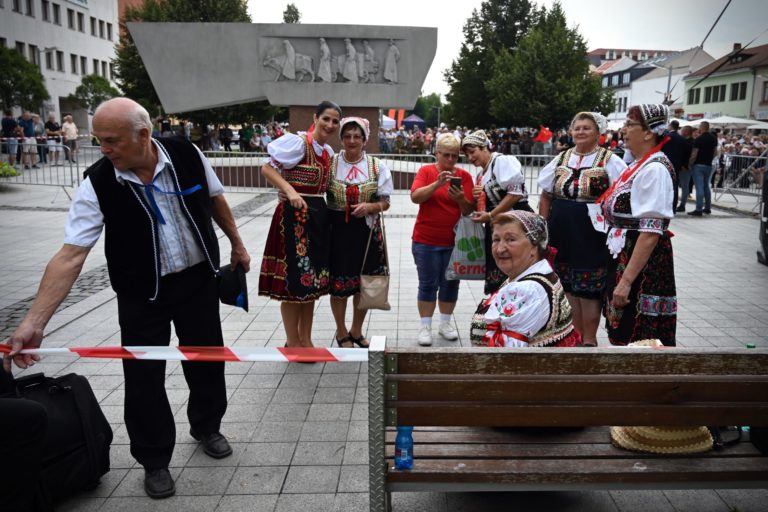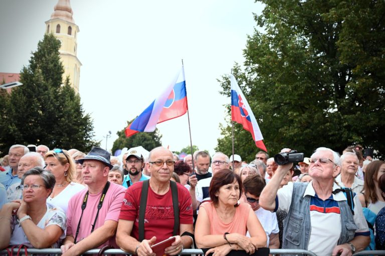 Atmosféra počas zhromaždenia organizovaného stranou SMER-SSD pri príležitosti 79. výročia Slovenského národného povstania (SNP) na Námestí SNP vo Zvolene. Zvolen, 29. august 2023. Foto: SITA/Jakub Julény.