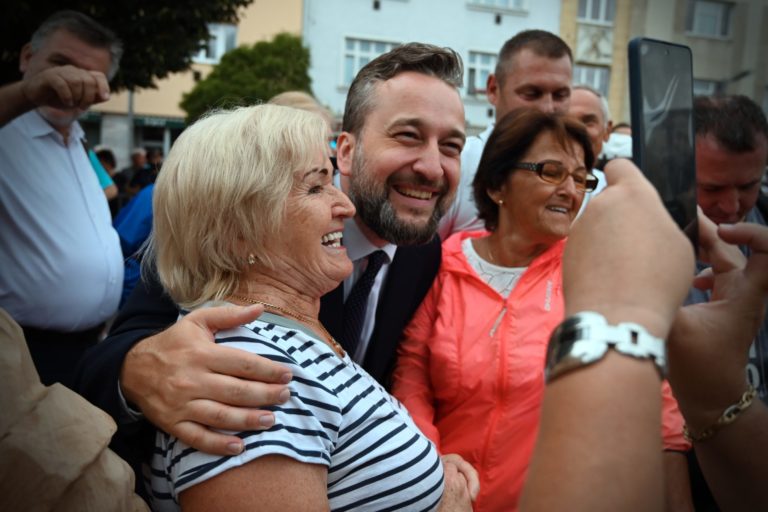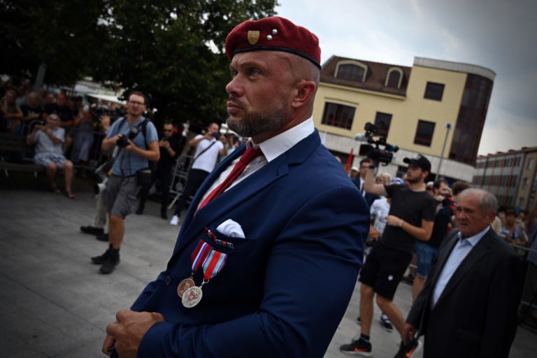 Podpredseda strany Republika (v popredí) sa zúčastnil na zhromaždení organizovaného stranou SMER-SSD pri príležitosti 79. výročia Slovenského národného povstania (SNP) na Námestí SNP vo Zvolene. Zvolen, 29. august 2023. Foto: SITA/Jakub Julény.