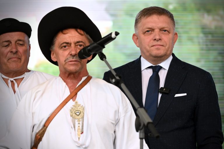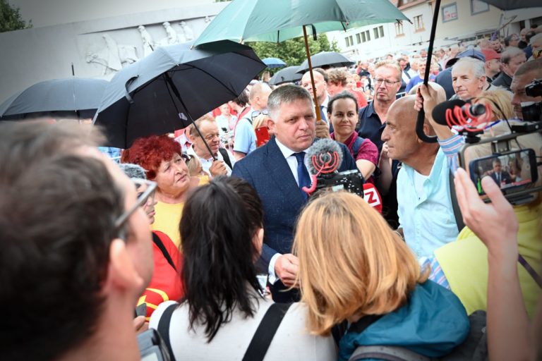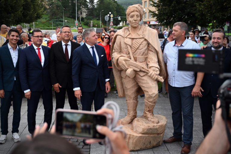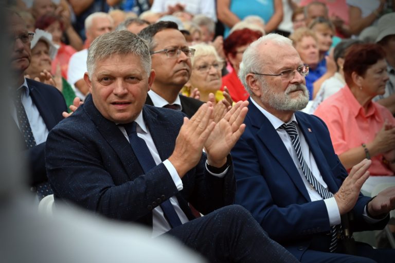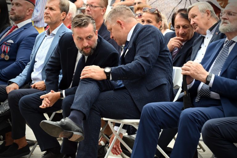 Predseda strany SMER-SSD Robert Fico (vpravo) počas zhromaždenia organizovaného stranou SMER-SSD pri príležitosti 79. výročia Slovenského národného povstania (SNP) na Námestí SNP vo Zvolene. Zvolen, 29. august 2023. Foto: SITA/Jakub Julény.