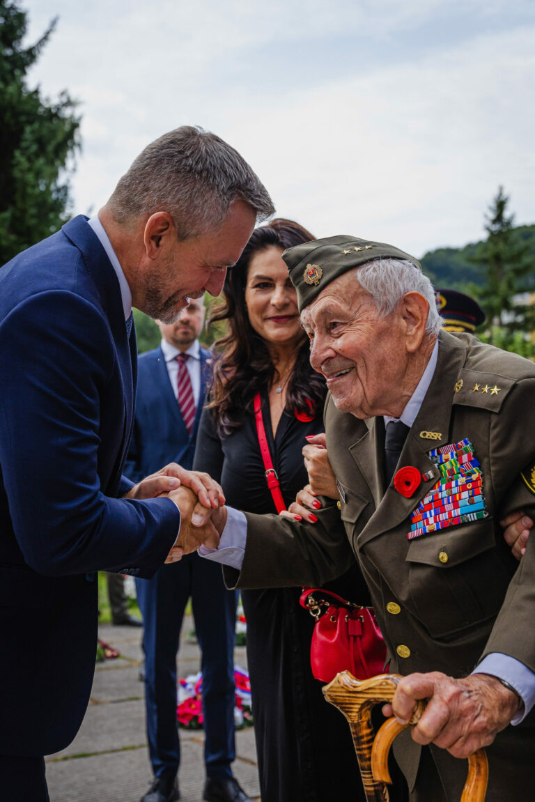 V popredí zľava: Prezident SR Peter Pellegrini a veterán Slovenského národného povstania (SNP) Vladimír Strmeň počas osláv 81. výročia Slovenského národného povstania (SNP) v areáli Múzea SNP v Banskej Bystrici. Banská Bystrica, 29. august 2025. Foto: SITA/Kancelária prezidenta SR