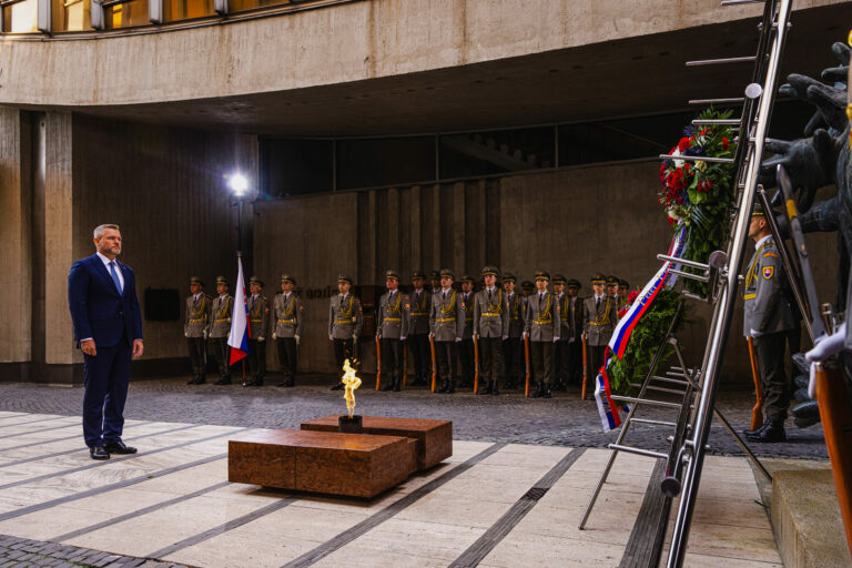 Prezident SR Peter Pellegrini počas pietneho aktu kladenia vencov pri príležitosti osláv 81. výročia Slovenského národného povstania (SNP) v areáli Múzea SNP v Banskej Bystrici. Banská Bystrica, 29. august 2025. Foto: SITA/Kancelária prezidenta SR