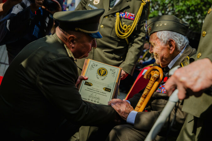 V popredí zľava: Náčelník Generálneho štábu (GŠ) Ozbrojených síl (OS) SR Daniel Zmeko a plukovník vo výslužbe Vladimír Strmeň, ktorému náčelník GŠ OS SR odovzdáva povýšenie do hodnosti plukovník počas osláv Dňa Ozbrojených síl Slovenskej republiky (OS SR) v rámci dňa výročia víťazstva slovenských dobrovoľníkov v bitke nad jednotkami cisárskej armády v roku 1848 (22. september) v Brezovej pod Bradlom. Brezová pod Bradlom, 28. september 2025. Foto: SITA/Kancelária prezidenta SR