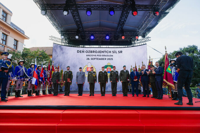 Náčelník Generálneho štábu (GŠ) Ozbrojených síl (OS) SR Daniel Zmeko (štvrtý sprava) a prezident SR Peter Pellegrini (piaty sprava) počas osláv Dňa Ozbrojených síl Slovenskej republiky (OS SR) v rámci dňa výročia víťazstva slovenských dobrovoľníkov v bitke nad jednotkami cisárskej armády v roku 1848 (22. september) v Brezovej pod Bradlom. Brezová pod Bradlom, 28. september 2025. Foto: SITA/Kancelária prezidenta SR
