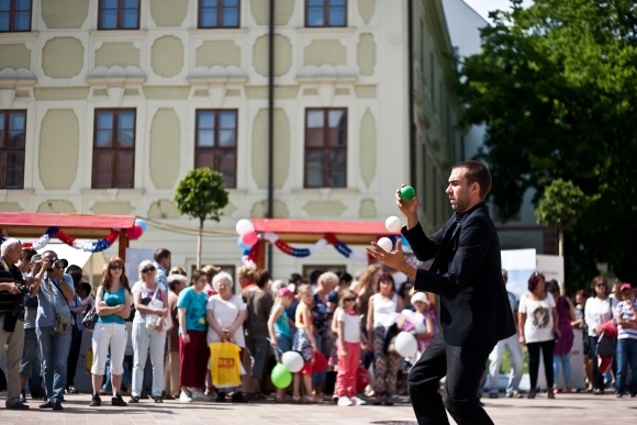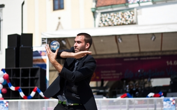 Žonglér Juraj počas osláv štátneho sviatku Francúzska - dobytia parížskej Bastily (1789) na Hlavnom námestí v Bratislave. 11. júl 2013. Foto: SITA/Gabriel Kuchta
