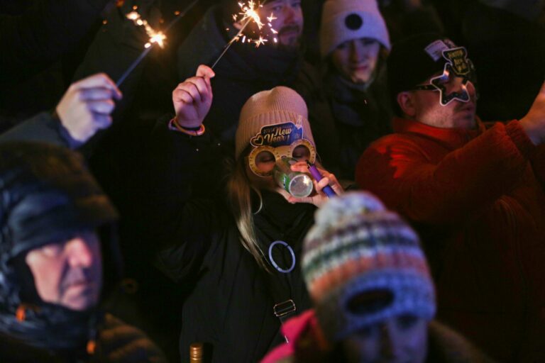 Ľudia s prskavkami počas osláv príchodu Nového roka 2025 a Dňa vzniku Slovenskej republiky na Rybnom námestí v Bratislave. Bratislava, 1. január 2025. Foto: SITA/Tomáš Susko.
