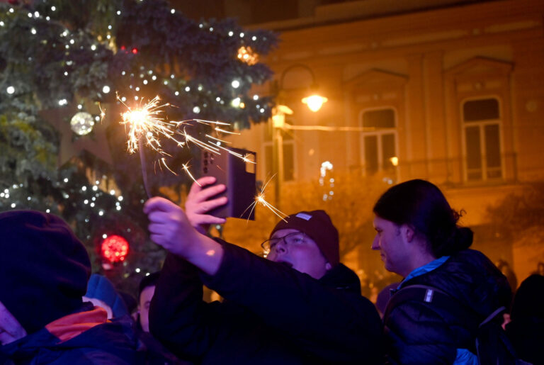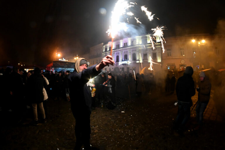 Ľudia s prskavkami počas osláv príchodu Nového roka 2025 a Dňa vzniku Slovenskej republiky na Hlavnej ulici v Prešove. Prešov, 1. január 2025. Foto: SITA/Viktor Zamborský.