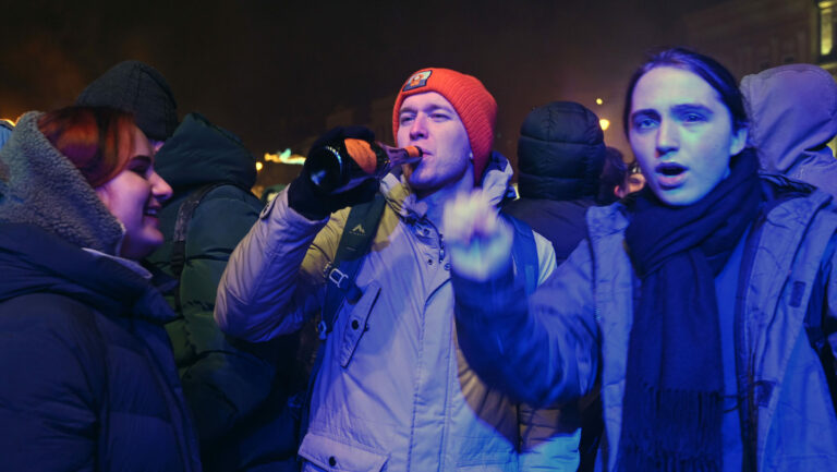Ľudia si pripíjajú počas osláv príchodu Nového roka 2025 a Dňa vzniku Slovenskej republiky na Hlavnej ulici v Prešove. Prešov, 1. január 2025. Foto: SITA/Viktor Zamborský.