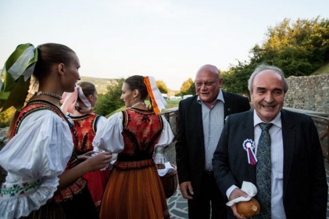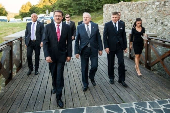 Zľava: Podpredseda Národnej rady SR Peter Žiga, prezident SR Peter Pellegrini počas príchodu na slávnostný program Celonárodných osláv pri príležitosti 1161. výročia príchodu sv. Cyrila a Metoda na územie dnešného Slovenska na Hrade Devín. Bratislava, 5. júl 2024. Foto: SITA