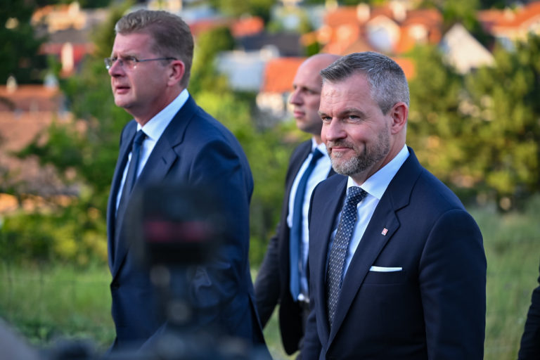 Zľava: Podpredseda Národnej rady SR Peter Žiga, prezident SR Peter Pellegrini počas príchodu na slávnostný program Celonárodných osláv pri príležitosti 1161. výročia príchodu sv. Cyrila a Metoda na územie dnešného Slovenska na Hrade Devín. Bratislava, 5. júl 2024. Foto: SITA