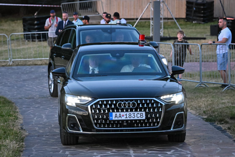 Vládna limuzína s predsedom vlády SR Robertom Ficom počas príchodu na slávnostný program Celonárodných osláv pri príležitosti 1161. výročia príchodu sv. Cyrila a Metoda na územie dnešného Slovenska na Hrade Devín. Bratislava, 5. júl 2024. Foto: SITA.