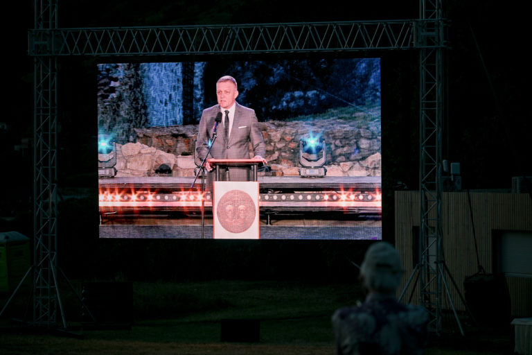 Predseda vlády SR Robert Fico počas príhovoru v rámci slávnostného programu Celonárodných osláv pri príležitosti 1161. výročia príchodu sv. Cyrila a Metoda na územie dnešného Slovenska na Hrade Devín. Bratislava, 5. júl 2024. Foto: SITA