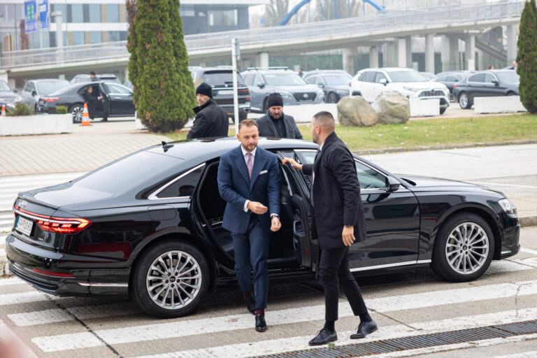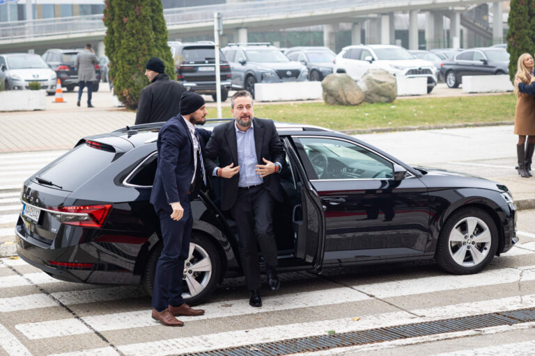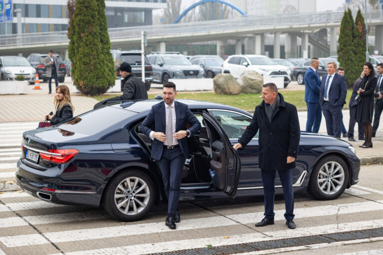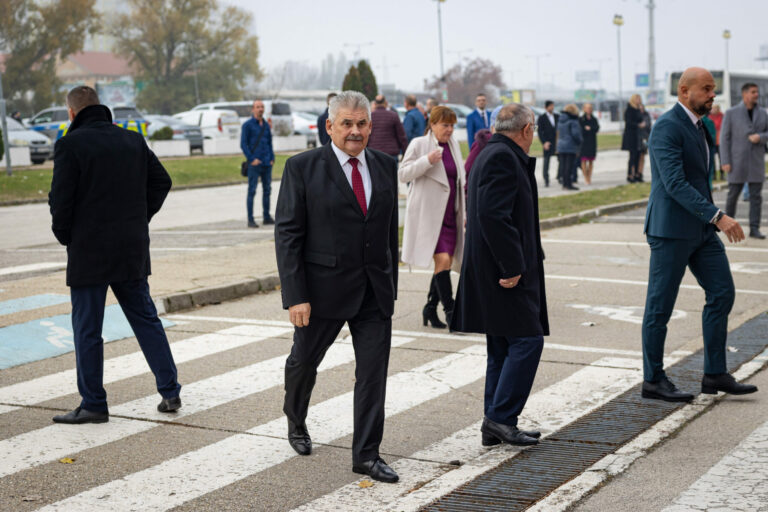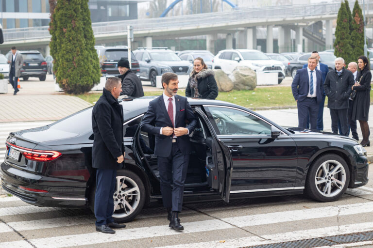 Podpredseda strany SMER-SD Juraj Blanár (v popredí vpravo) počas príchodov v rámci osláv strany Smer - sociálna demokracia pri príležitosti 25. výročia založenia strany. Bratislava, 17. november 2024. Foto: SITA/Jana Birošová