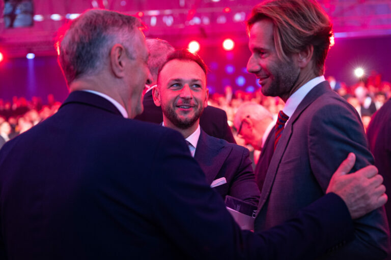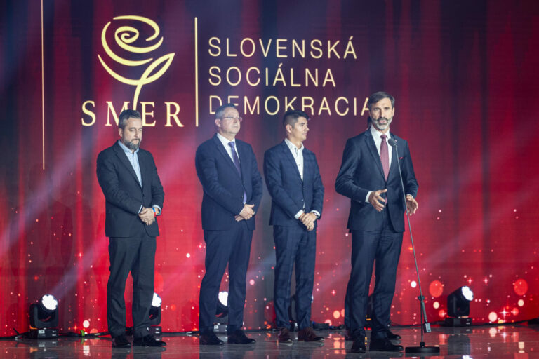 Minister vnútra SR Matúš Šutaj Eštok (uprostred) počas osláv strany Smer - sociálna demokracia pri príležitosti 25. výročia založenia strany. Bratislava, 17. november 2024. Foto: SITA/Jana Birošová