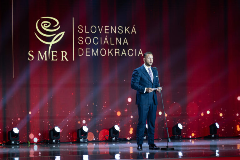 Predseda strany Hlas - sociálna demokracia Matúš Šutaj Eštok počas osláv strany Smer - sociálna demokracia pri príležitosti 25. výročia založenia strany. Bratislava, 17. november 2024. Foto: SITA/Jana Birošová