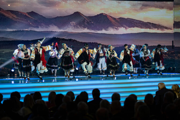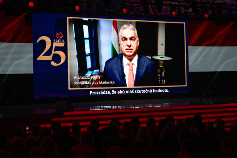 Predseda vlády Maďarska Viktor Orbán (na obrazovke) počas osláv strany Smer - sociálna demokracia pri príležitosti 25. výročia založenia strany. Bratislava, 17. november 2024. Foto: SITA/Jana Birošová