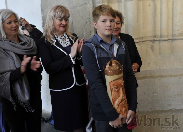 Mladý umelec so svojou drevorezbou Kráľa Svätopluka, ktorú plánuje venovať premiérovi Robertovi Ficovi, počas osláv Ústavy SR v areáli Bratislavského hradu. Bratislava, 1. september 2014. Foto: SITA/Ján Slovák