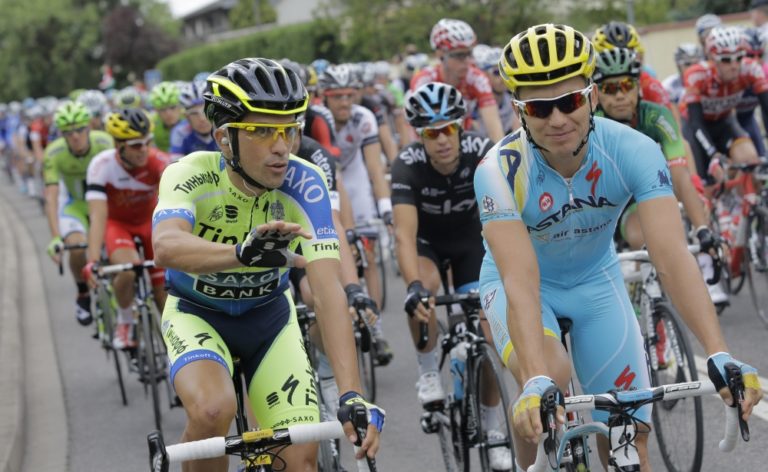 Kazašský cyklista Maxim Iglinskiy (vpravo) a Španiel Alberto Contador počas ôsmej etapy Tour de France, ktorá merala 161 kilometrov a viedla z Tomblaine do Gérardmer La Mauselaine. Foto: SITA/AP