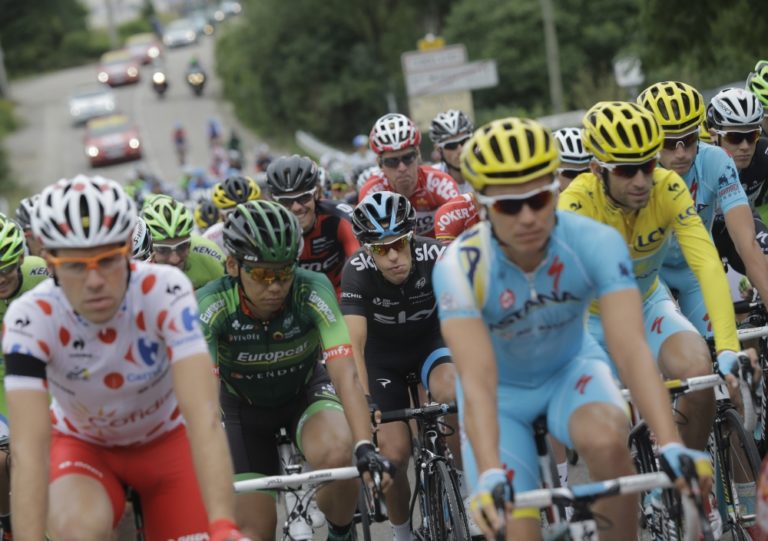 Zľava: Najlepší vrchár v doterajšom 101. ročníka Tour de France Cyril Lemoine, líder Vincenzo Nibali a prvý muž bodovacej súťaže Peter Sagan počas ôsmej etapy, ktorá merala 161 kilometrov a viedla z Tomblaine do Gérardmer La Mauselaine. Foto: SITA/AP