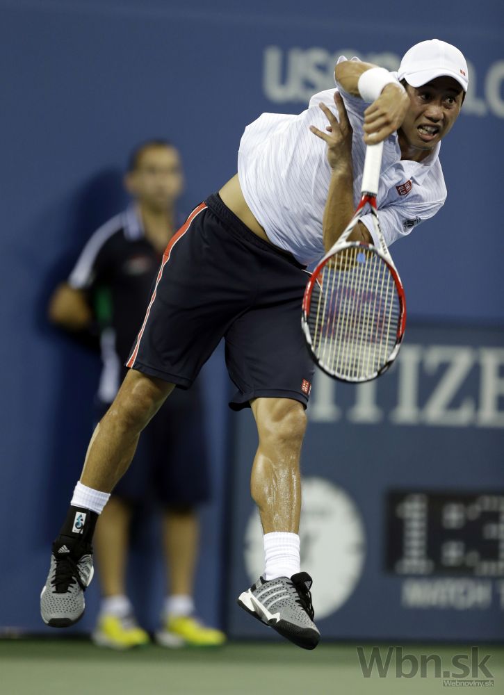 Japonský tenista Kei Nishikori počas osemfinálového zápasu na US Open v ktorom porazil Kanaďana Milosa Raonica 4:6, 7:6 (7:4), 6:7 (6:8), 7:5, 6:4. Foto: SITA/AP