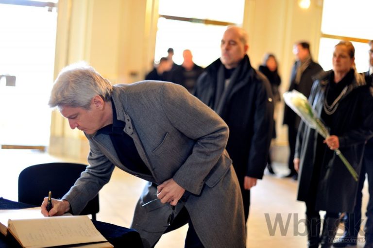Kondolenčná kniha počas poslednej rozlúčky so zosnulým režisérom Martinom Ťapákom v starej budove SND. Bratislava, 6. február 2015. Foto: SITA/Robert Tappert