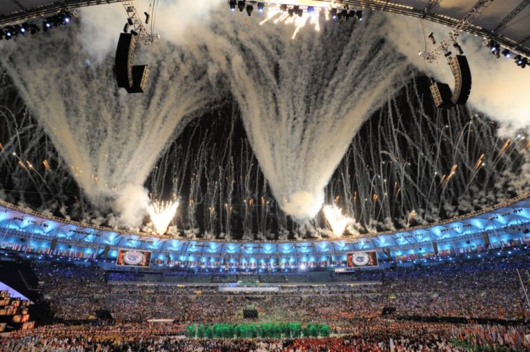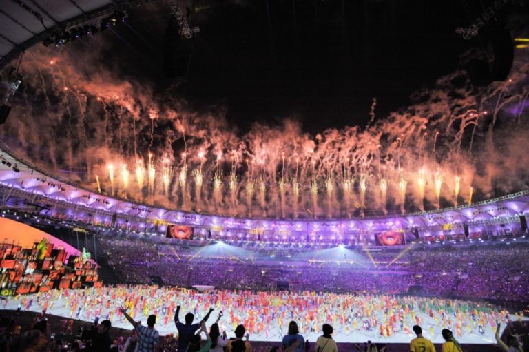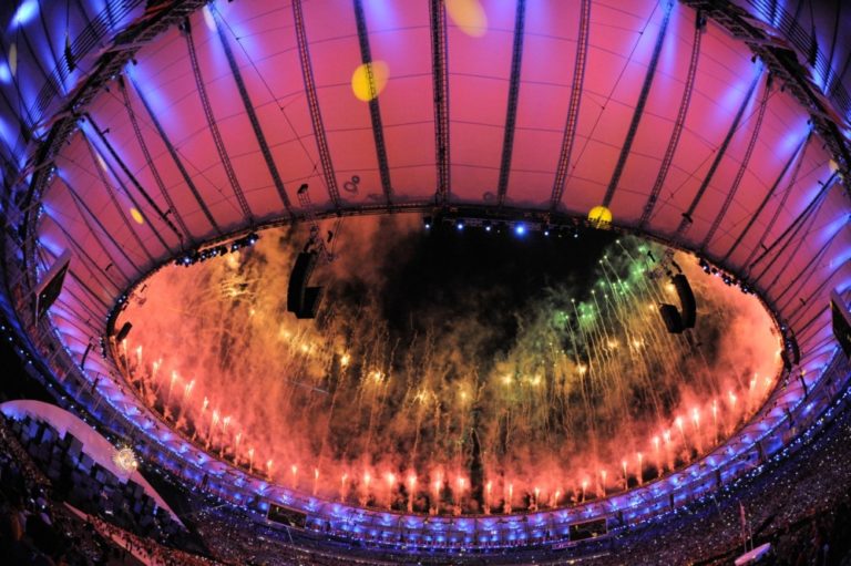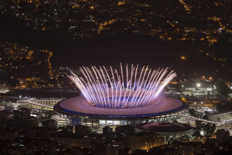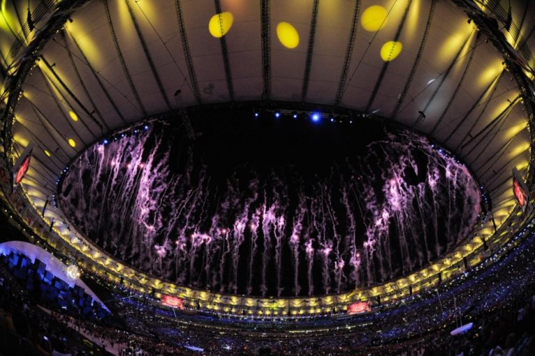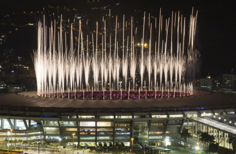 Ohňostroj počas otváracieho ceremoniálu OH 2016 na štadióne Maracana. Rio de Janeiro, 5. august 2016. Foto: SITA/AP