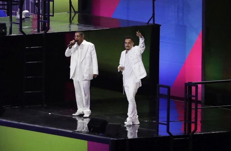 Speváci Zeca Pagodinho (vľavo) a Marcelo D2 počas otváracieho ceremoniálu OH 2016 na štadióne Maracana. Rio de Janeiro, 5. august 2016. Foto: SITA/AP
