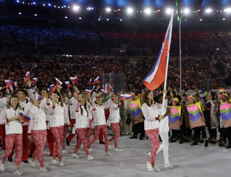 Slovenská vlajka na štadióne Maracana v rámci otváracieho ceremoniálu letných OH 2016 počas oficiálneho otvorenia Hier XXXI. olympiády v Riu de Janeiro. Rio de Janeiro, Brazília, 5. august 2016. Foto: SITA/Martin Medňanský