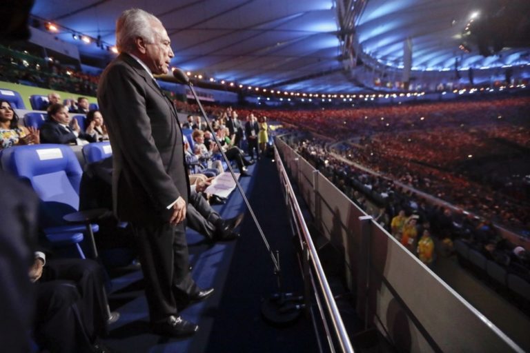 Vicepremiér Brazílie Michel Temer povedal tradičnú formulku a otvoril Hry XXXI. olympiády. Rio de Janeiro, 5. august 2016. Foto: SITA/AP