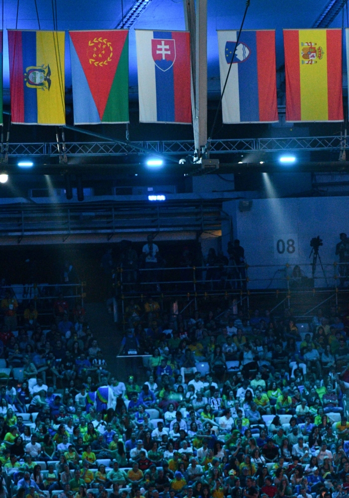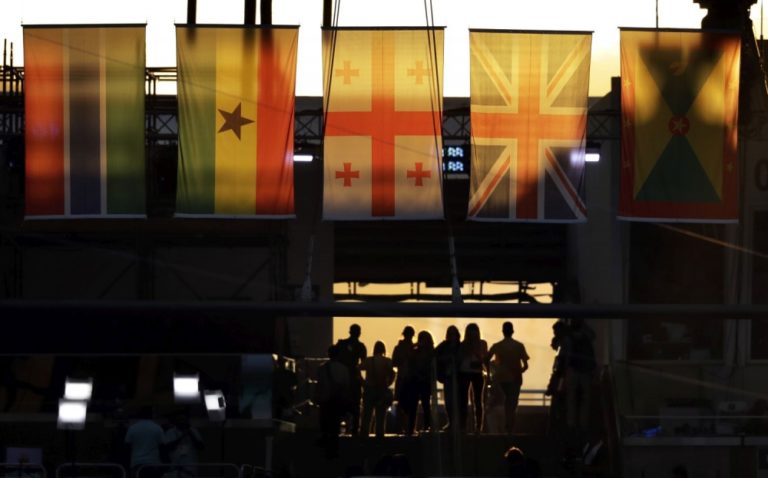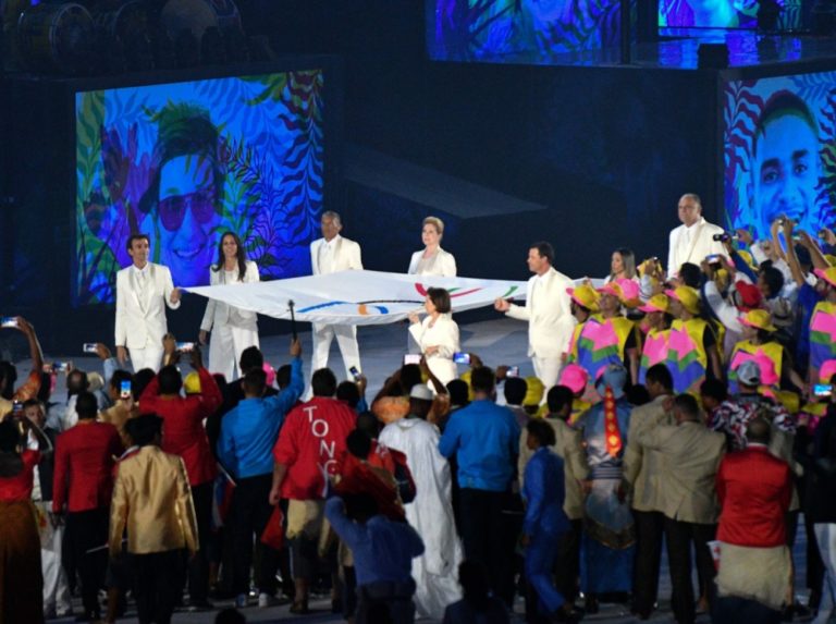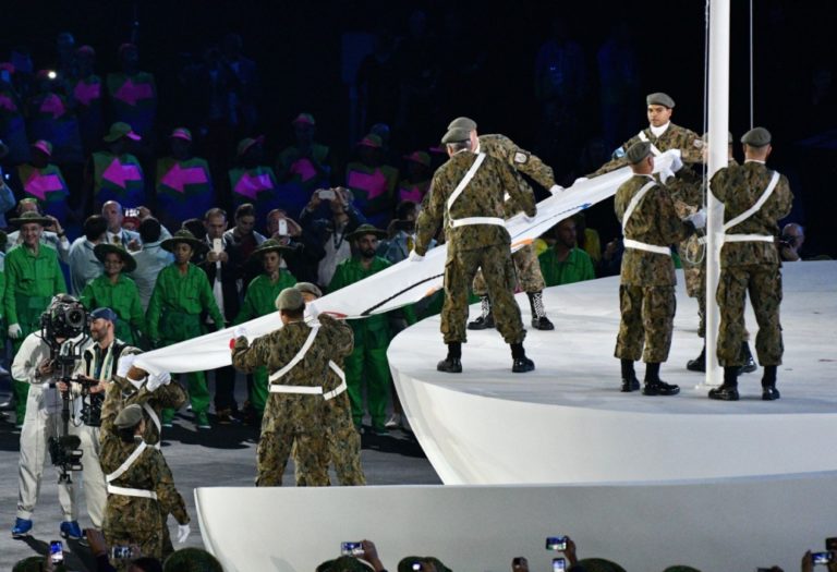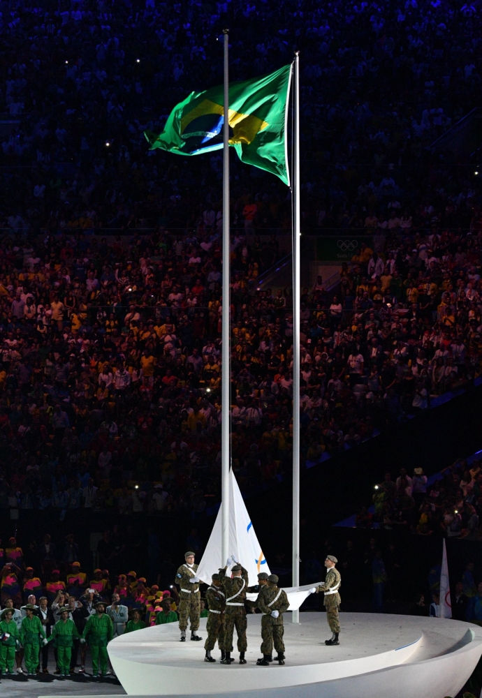 Vztyčovanie olympijskej vlajky počas otváracieho ceremoniálu letných OH 2016 v rámci oficiálneho otvorenia Hier XXXI. olympiády v Riu de Janeiro. Rio de Janeiro, Brazília, 5. august 2016. Foto: SITA/Martin Medňanský