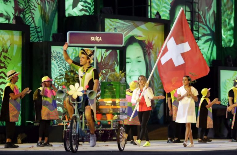 Švajčiarska vlajkonosička Giulia Battulgaová počas otváracieho ceremoniálu OH 2016. Rio de Janeiro, 5. august 2016. Foto: SITA/AP