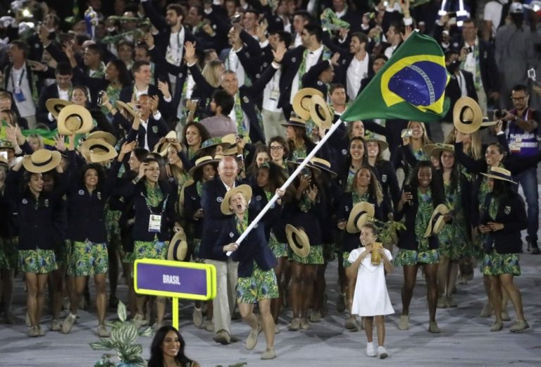 Brazílski športovci prinášajú olympijskú vlajku počas otváracieho ceremoniálu letných OH 2016 v rámci oficiálneho otvorenia Hier XXXI. olympiády v Riu de Janeiro. Rio de Janeiro, Brazília, 5. august 2016. Foto: SITA/Martin Medňanský