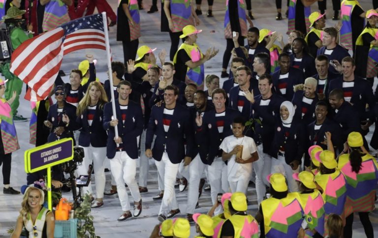 Americký vlajkonosič Michael Phelps počas otváracieho ceremoniálu OH 2016. Rio de Janeiro, 5. august 2016. Foto: SITA/AP