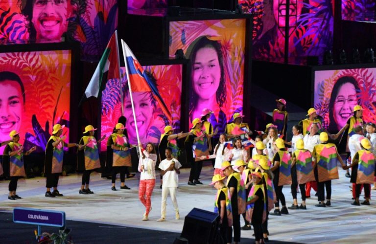 Vlajkonosička slovenskej výpravy Danka Barteková (vľavo) a členovia slovenskej výpravy počas otváracieho ceremoniálu letných OH 2016 v rámci oficiálneho otvorenia Hier XXXI. olympiády v Riu de Janeiro. Rio de Janeiro, Brazília, 5. august 2016. Foto: SITA/Martin Medňanský