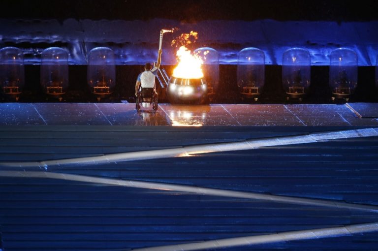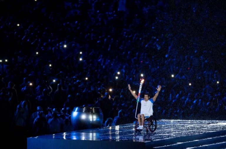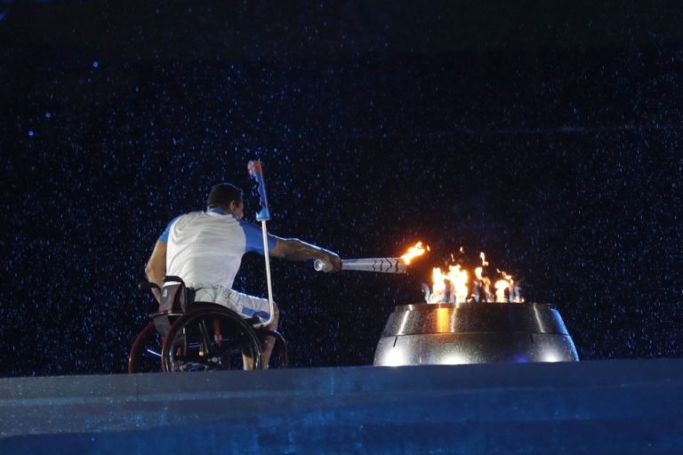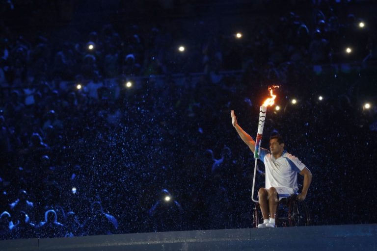 Slávnostný akt zapálenia paralympijského ohňa bol vyvrcholením krátkej štafety pochodne, posledným jej členom bol plavec Clodoaldo Silva, s trinástimi medailami (6-5-2) najúspešnejší brazílsky paralympionik, ktorý po PH 2016 plánuje ukončiť aktívnu športovú kariéru. Rio de Janeiro, 7. september 2016. Foto: Bob Martin/OIS/IOC via AP