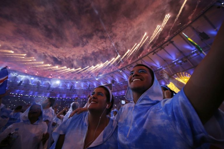 Športovci sledujú veľkolepý ohňostroj počas otváracieho ceremoniálu letnej paralympiády na štadióne Maracana. Rio de Janeiro, 7. september 2016. Foto: SITA/AP