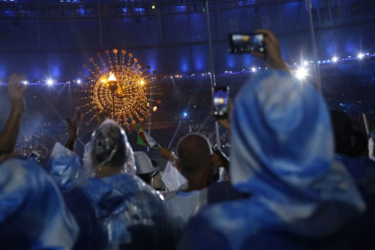 Športovci si fotia paralympijský oheň počas otváracieho ceremoniálu letnej paralympiády na štadióne Maracana. Rio de Janeiro, 7. september 2016. Foto: SITA/AP