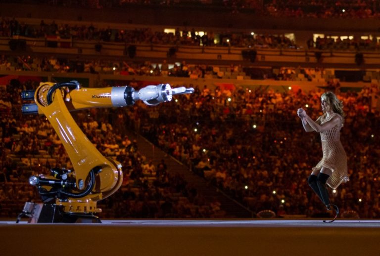 Amy Purdy tancuje s robotom počas otváracieho ceremoniálu letnej paralympiády na štadióne Maracana. Rio de Janeiro, 7. september 2016. Foto: Al Tielemans/OIS/IOC via AP