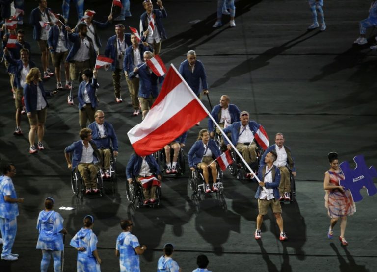 Reprezentanti Rakúska počas otváracieho ceremoniálu letnej paralympiády na štadióne Maracana. Rio de Janeiro, 7. september 2016. Foto: SITA/AP