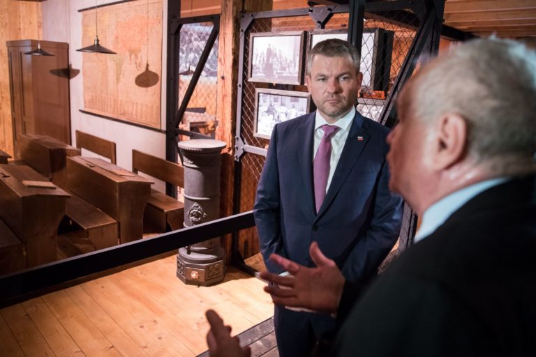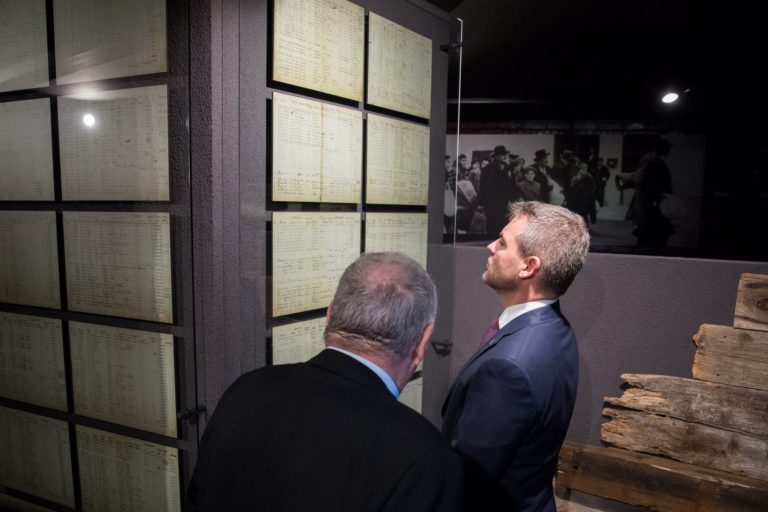 Zľava: Predseda vlády SR Peter Pellegrini a riaditeľ Múzea židovskej kultúry SNM v Bratislave Pavol Mešťan počas sprístupnenia novej časti expozície Múzea holokaustu v Seredi vo štvrtom zrekonštruovanom pôvodnom baraku. Sereď, 7. september 2018. Foto: SITA/Diana Černáková