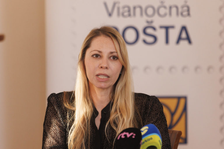 Výkonná riaditeľka Poštovej banky Melinda Burdanová počas tlačovej konferencie k otvoreniu 24. ročníka Vianočnej pošty (Napíš list Ježiškovi) spojenej s inauguráciou vianočnej známky a obálky prvého dňa (FDC) v budove Slovenskej pošty v Bratislave. Bratislava, 14. november 2022. Foto: SITA/Branislav Bibel