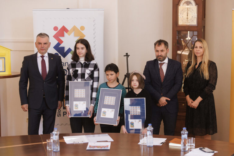 Generálny riaditeľ Slovenskej pošty Ľubomír Mindek (vpravo), štátny tajomník Ministerstva dopravy a výstavby SR Jaroslav Kmeť (vľavo) a detský kolektív autorov návrhov poštových vianočných známok počas tlačovej konferencie k otvoreniu 24. ročníka Vianočnej pošty (Napíš list Ježiškovi) spojenej s inauguráciou vianočnej známky a obálky prvého dňa (FDC) v budove Slovenskej pošty v Bratislave. Bratislava, 14. november 2022. Foto: SITA/Branislav Bibel