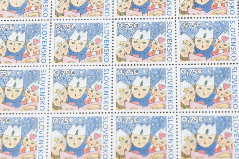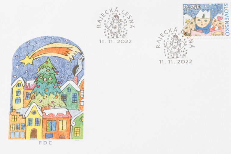 Ukážka vianočných poštových známok počas tlačovej konferencie k otvoreniu 24. ročníka Vianočnej pošty (Napíš list Ježiškovi) spojenej s inauguráciou vianočnej známky a obálky prvého dňa (FDC) v budove Slovenskej pošty v Bratislave. Bratislava, 14. november 2022. Foto: SITA/Branislav Bibel
