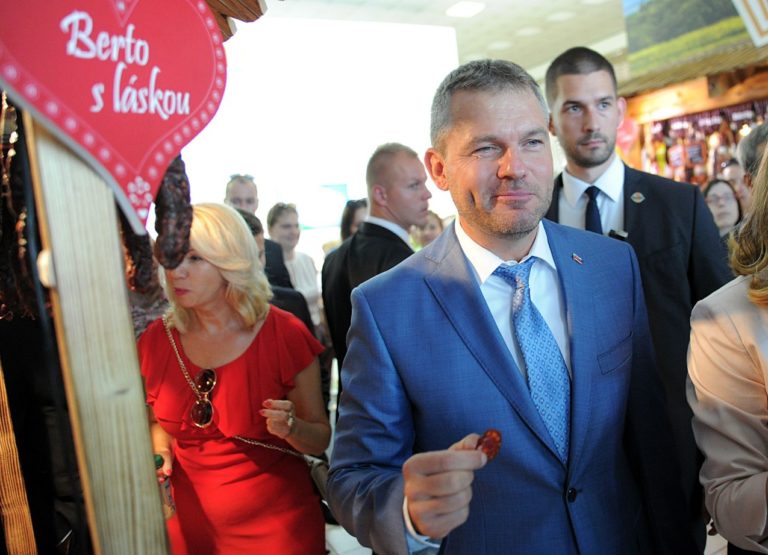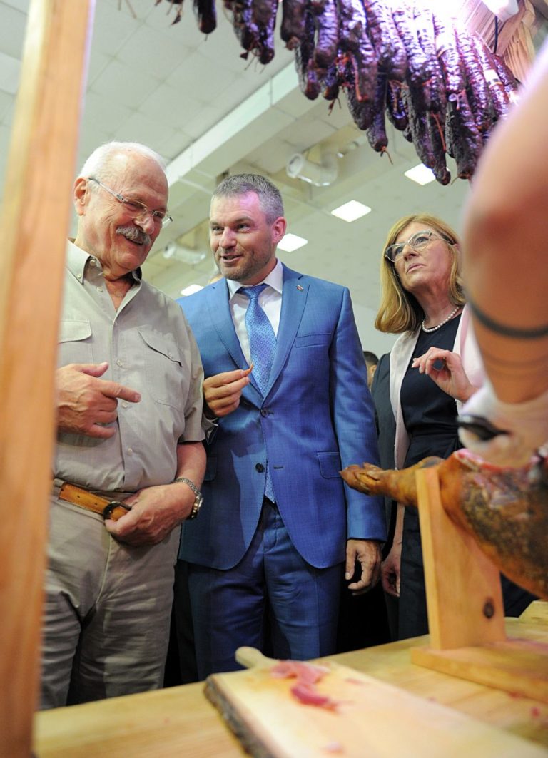 Predseda vlády Peter Pellegrini ochutnáva klobásu počas prehliadky slovenských produktov v rámci prehliadky 13. ročníka Národnej výstavy hospodárskych zvierat a 45. medzinárodnej poľnohospodárskej a potravinárskej výstavy - Agrokomplex. Nitra, 16. august 2018. Foto: SITA/Martin Havran