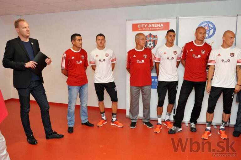 Zľava: Športový manažér Marek Ondrejka, Marek Ujlaky, Lukáš Greššák, Stanislav Jarábek, Ivan Schranz, Miroslav Karhan, Marek Janečka počas tlačového brífingu v rámci otvorenie City Arény v Trnave. Trnava, 21. august 2015. Foto: SITA/Ivan Kopčáni