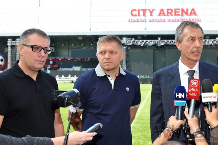 Zľava: Prezident Slovenského futbalového zväzu Ján Kováčik, predseda vlády Robert Fico a architekt Pavol Adamec počas otvorenia City Arény v Trnave. Trnava, 22. august 2015. Foto: SITA/Ivan Kopčáni