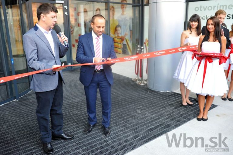 Zľava: Moderátor Andrej Bičan a riaditeľ centra Norbert Kuklovský počas prestrihnutia pásky v rámci otvorenia nákupného centra City Aréna pre verejnosť. Trnava, 22. august 2015. Foto: SITA/Ivan Kopčáni